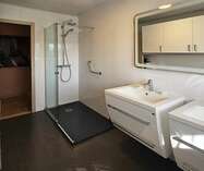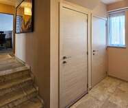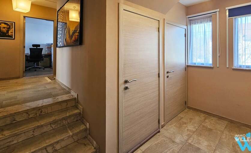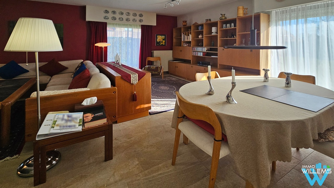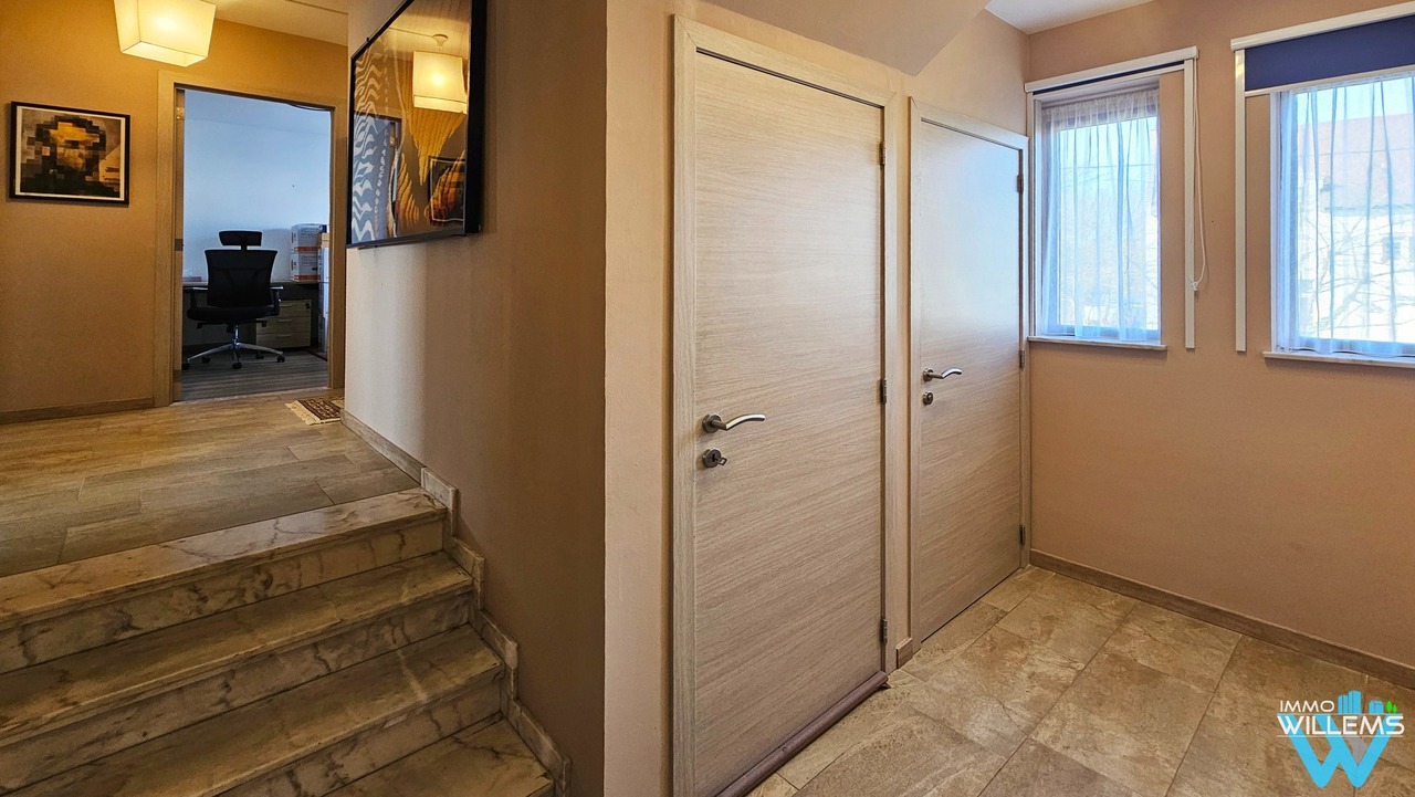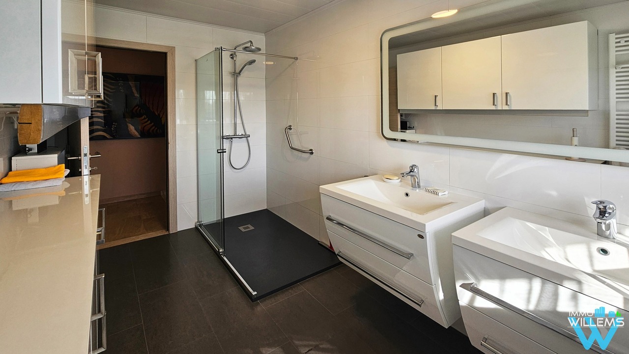 De woning beschikt over een ruime inkomhal met vestiaire en gastentoilet, een gezellige woon- en eetkamer en een afzonderlijke keuken. Op het gelijkvloers bevinden zich twee slaapkamers en een badkamer met douche en dubbele wastafel.